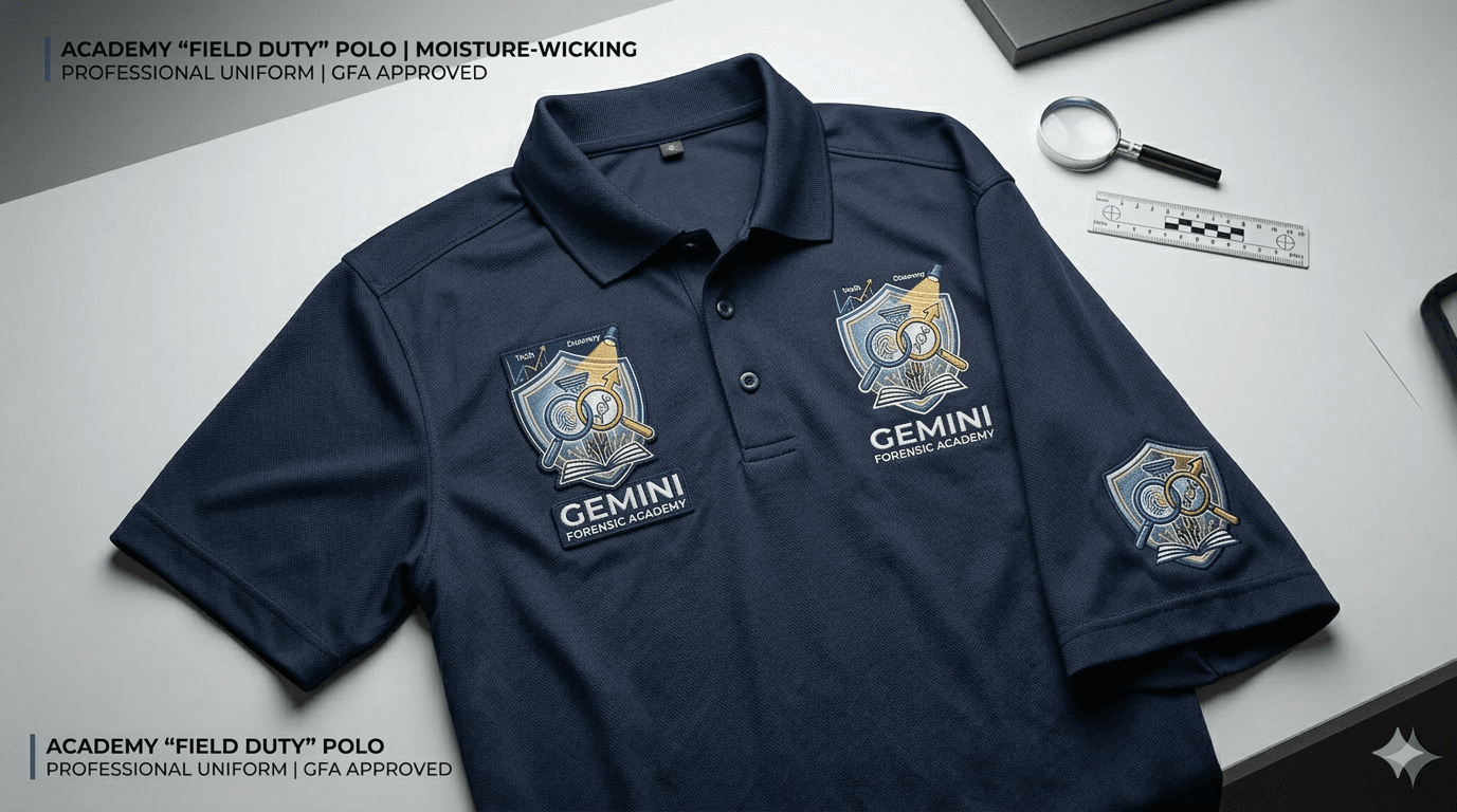 Moisture-Wicking Professional Uniform | GFA Approved Engineered for the Junior Investigator, the official Gemini Forensic Academy “Field Duty” Polo combines professionalism with high-performance functionality. Designed to mirror the technical precision and analytical rigor of our curriculum, this polo ensures you look and perform at your best, from active crime scene simulations to complex digital forensic analysis.